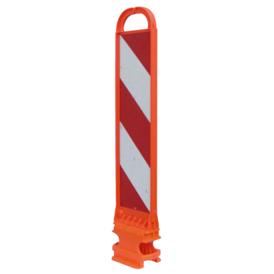 2 Führungsnuten und Rastnocken in der Einschubvorrichtung der Leitschwelle sichern den Leitboy fest in seiner Position. Er löst sich nicht, wenn er von einem Fahrzeug direkt überfahren wird (s. Prüfbericht der BASt), und richtet sich, dank flexiblem Gummifuß selbsttätig wieder auf. Die vollständige Warnwirkung und Verkehrsführung bleiben erhalten.
