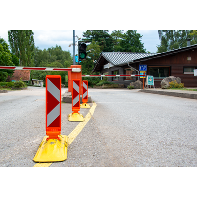 2 Führungsnuten und Rastnocken in der Einschubvorrichtung der Leitschwelle sichern den Leitboy fest in seiner Position. Er löst sich nicht, wenn er von einem Fahrzeug direkt überfahren wird (s. Prüfbericht der BASt), und richtet sich, dank flexiblem Gummifuß selbsttätig wieder auf. Die vollständige Warnwirkung und Verkehrsführung bleiben erhalten.