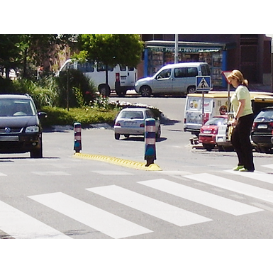 Die runde Form des Pollers erhöht die Stabilität bei Kollisionen aus allen Fahrtrichtungen. Der Leitboy-Poller richtet sich nach einer Fahrzeugberührung, dank flexiblem Gummifuß, selbsttätig wieder auf.