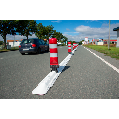 Die runde Form des Pollers erhöht die Stabilität bei Kollisionen aus allen Fahrtrichtungen. Der Leitboy-Poller richtet sich nach einer Fahrzeugberührung, dank flexiblem Gummifuß, selbsttätig wieder auf.