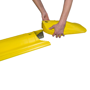 Das abgeschrägte Endstück B für Leitschwellen, in gelb, enthält eine Sicherungsschraube. Es ist wie die Leitschwelle selbst aus Recyclingmaterial und mit dem Anti-Rutsch System ARS ausgestattet.