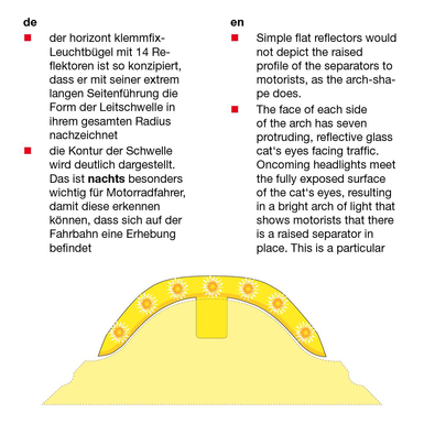 Durch Leuchtbügel auf jedem Leitschwellen-Element, kann noch mehr Sicherheit gewährleistet werden. Der Leuchtbügel, erhältlich in gelb oder weiß, mit 14 Reflektoren ist so konzipiert, dass er mit seiner extrem langen Seitenführung die Form der Leitschwelle in ihrem gesamten Verlauf nachzeichnet.